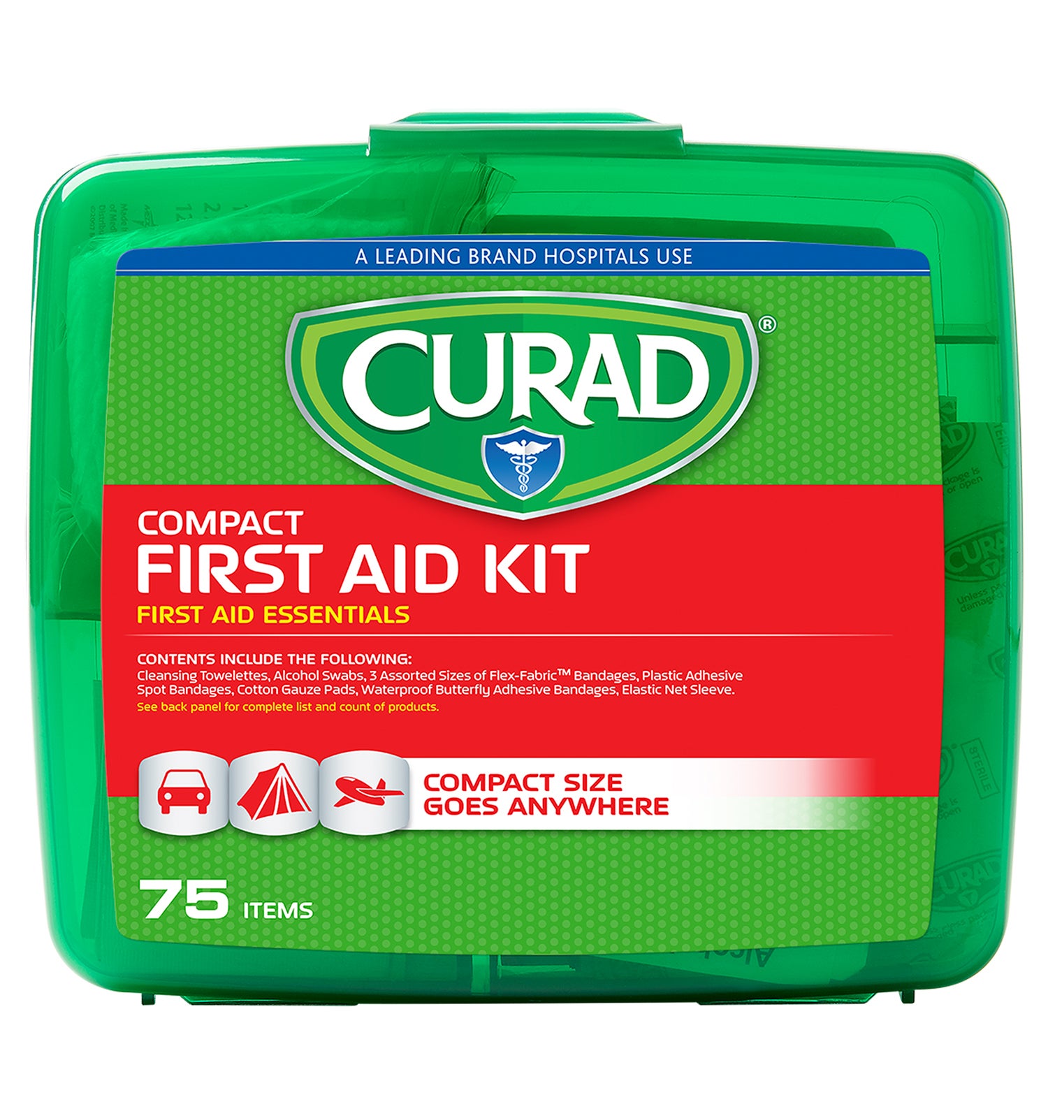 Curad Compact First Aid Kit 75 Piece 1 Set CURFAK200RB. Curad Compact First Aid Kit Green 75 Items 1 Each 1099. Filled with 75 items it contains multiple sizes of bandages including butterfly bandages.